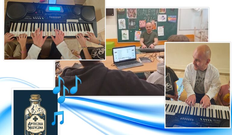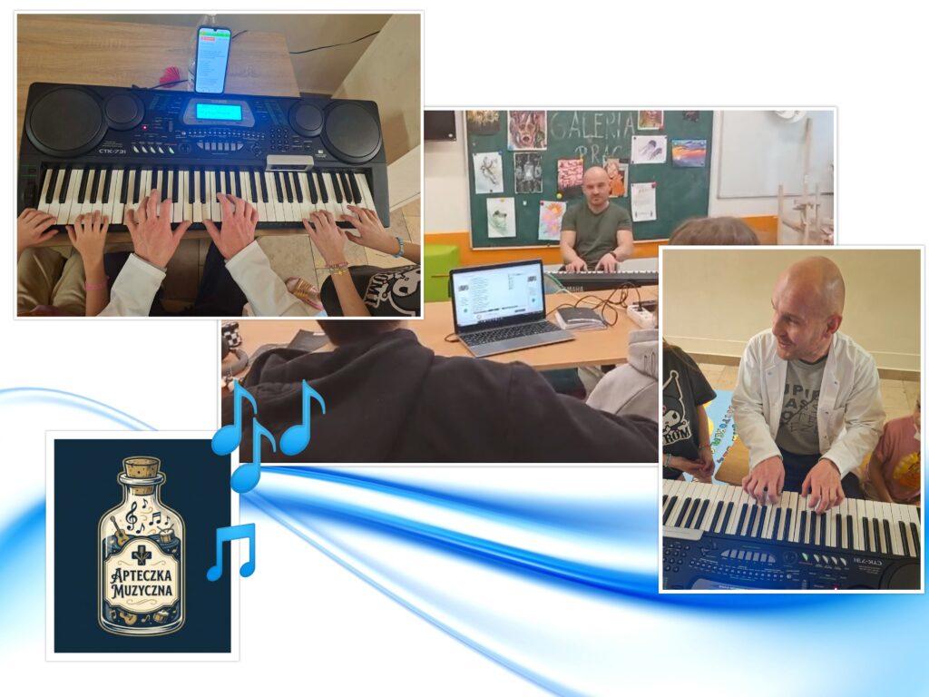 W ramach innowacji „Apteczka muzyczna” w roku szkolnym 2025/26 uczniowie  mają możliwość uczęszczania  na zajęcia muzykoterapeutyczne,  podczas których usprawniają  psychomotorykę, obniżają napięcie psychofizyczne i emocjonalne, redukują niepokój oraz zwiększają swoje poczucie bezpieczeństwa. Zajęcia te dostarczają radości i przyjemności z muzykowania, co wpływa na poprawę samopoczucia i przyspiesza proces zdrowienia.