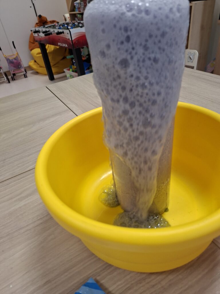 Zajęcia z wykorzystaniem doświadczeń chemicznych pozwoliły dzieciom poczuć się jak mali naukowcy, co budowało ich pewność siebie i pasję do odkrywania otaczającego ich świata.