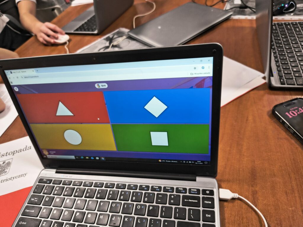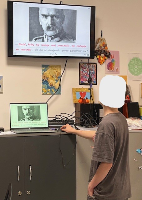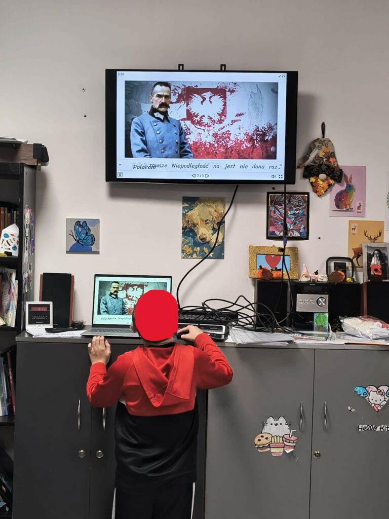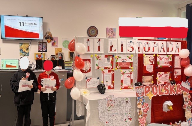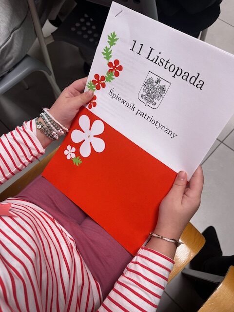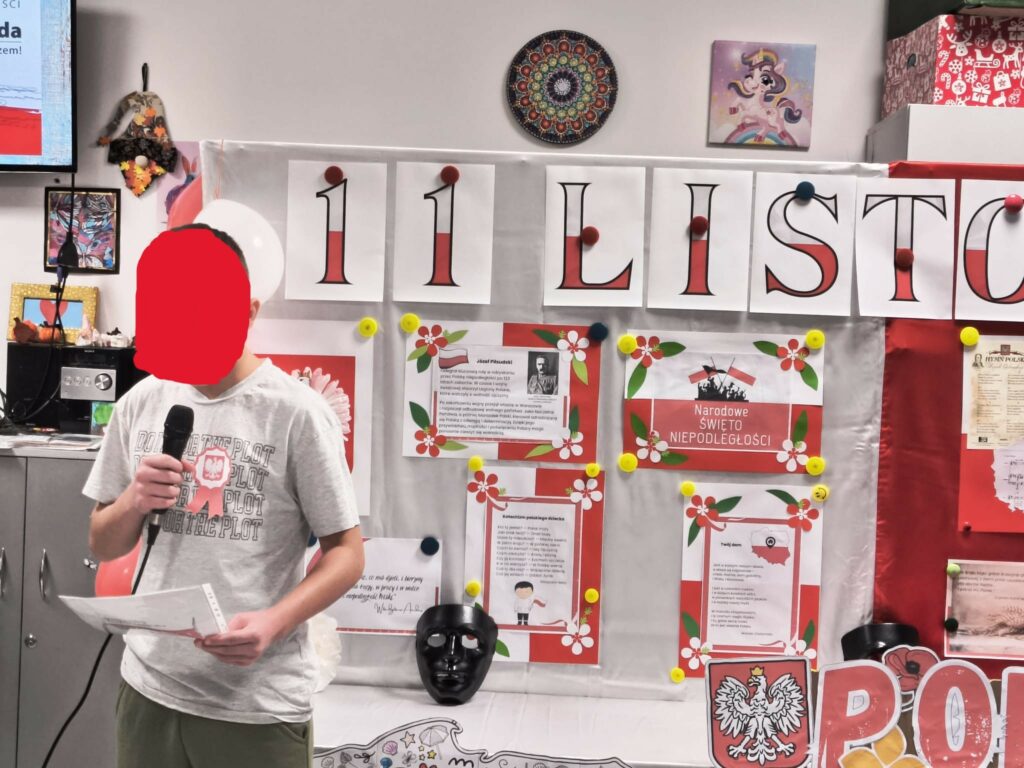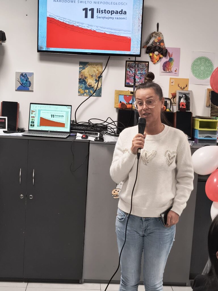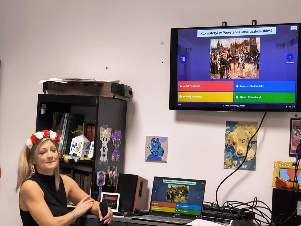Dalsza część obchodów miała formę kreatywnych warsztatów historycznych podczas, których uczniowie poznawali losy Polski na drodze do niepodległości. Nasi podopieczni obejrzeli film edukacyjny, a następnie z zaangażowaniem brali udział w interaktywnych quizach na platformie Kahoot!, grach i konkursach o tematyce narodowej – w tym w emocjonującej grze „Koło fortuny”. Nie zabrakło również recytacji poezji oraz wspólnego śpiewania pieśni patriotycznych i legionowych.