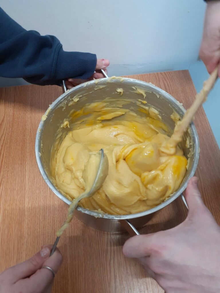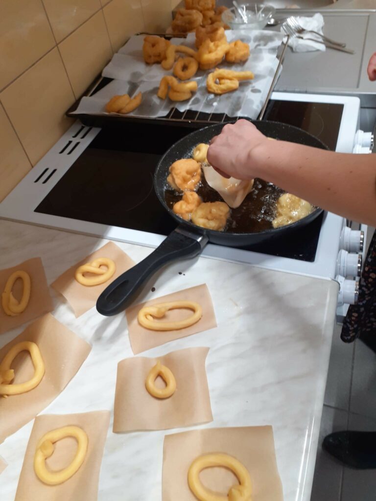 Młodzież, pod czujnym okiem wychowawczyni, przygotowała gniazdka znane również pod innymi nazwami: pączki poznańskie lub hiszpańskie churros. Pacjenci przygotowali ciasto, napychali masę do szpryc i i formowali kształty na papierze do pieczenia. Po usmażeniu i wystudzeniu udekorowaliśmy gniazdka cytrynowym lukrem.